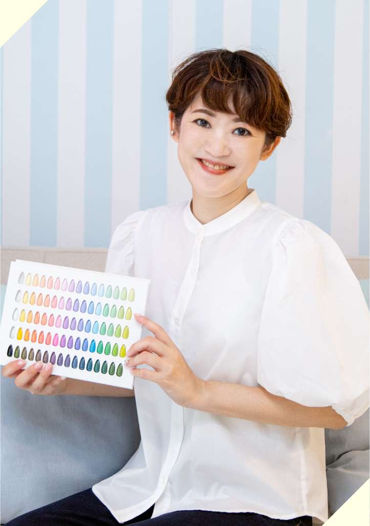 大学を卒業後、広告代理店にて営業として勤務。結婚後、派遣社員として働いている傍らネイルスクールに通い、ネイリストに。コスメや美容の正しい知識を持つ化粧品検定1級も取得し、「皮膚の一部」である爪のケアにも豊富な知識をもつネイリスト。